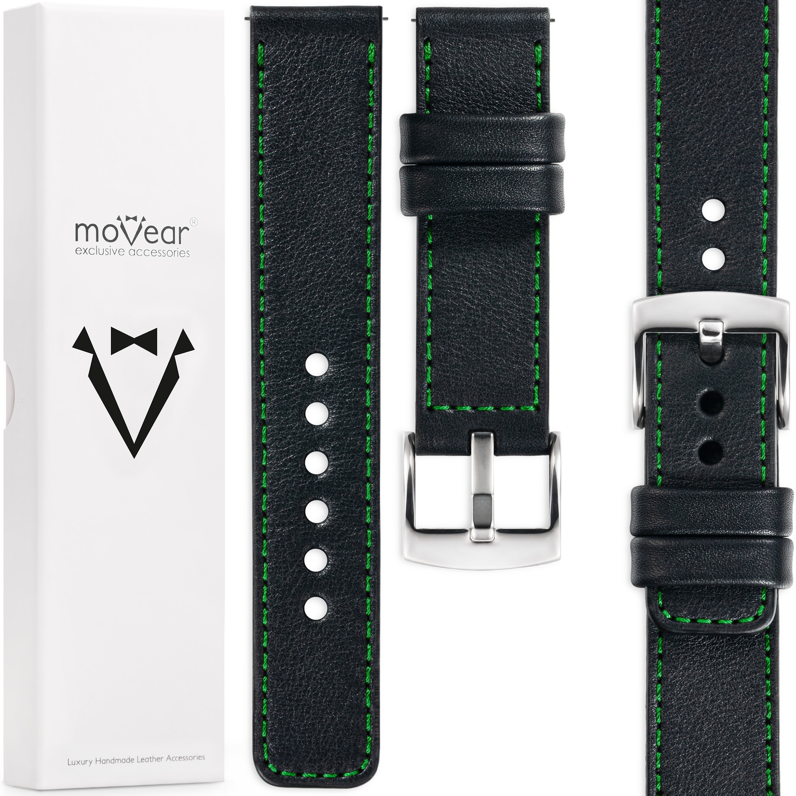 ✅ moVear Prestige C1 kožený řemínek 24 mm pro hodinky / chytré hodinky | černý, zelené prošití