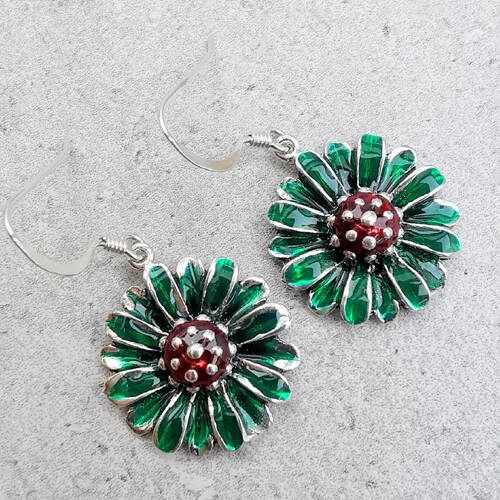 Závěsné stříbrné náušnice s kopretiny pokryté zelenočerveným smaltem.