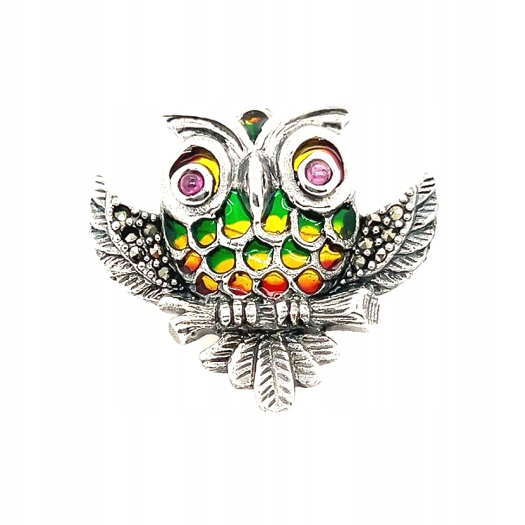 Zaujme svým šarmem brož, která se stane doplňkem každého výtvoru. Brož – sova, má nádherné barvy, je naplněna vitrážovým sklem a oči jsou osázeny přírodními rubíny.