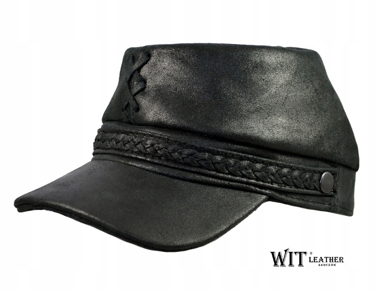 Historická čepice vyrobená z přírodní hovězí kůže typu „Krek“ v originální černé barvě. Čepice je ozdobena koženým úpletem a zevnitř má elegantní podšívku.