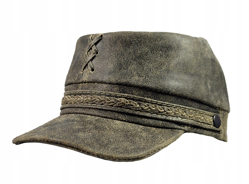 Elegantní čepice čepice vyrobená z přírodní hovězí kůže typu „Stará Amerika“ v originálním odstínu popelavé barvy. Čepice je ozdobena koženým úpletem a zevnitř má elegantní podšívku.