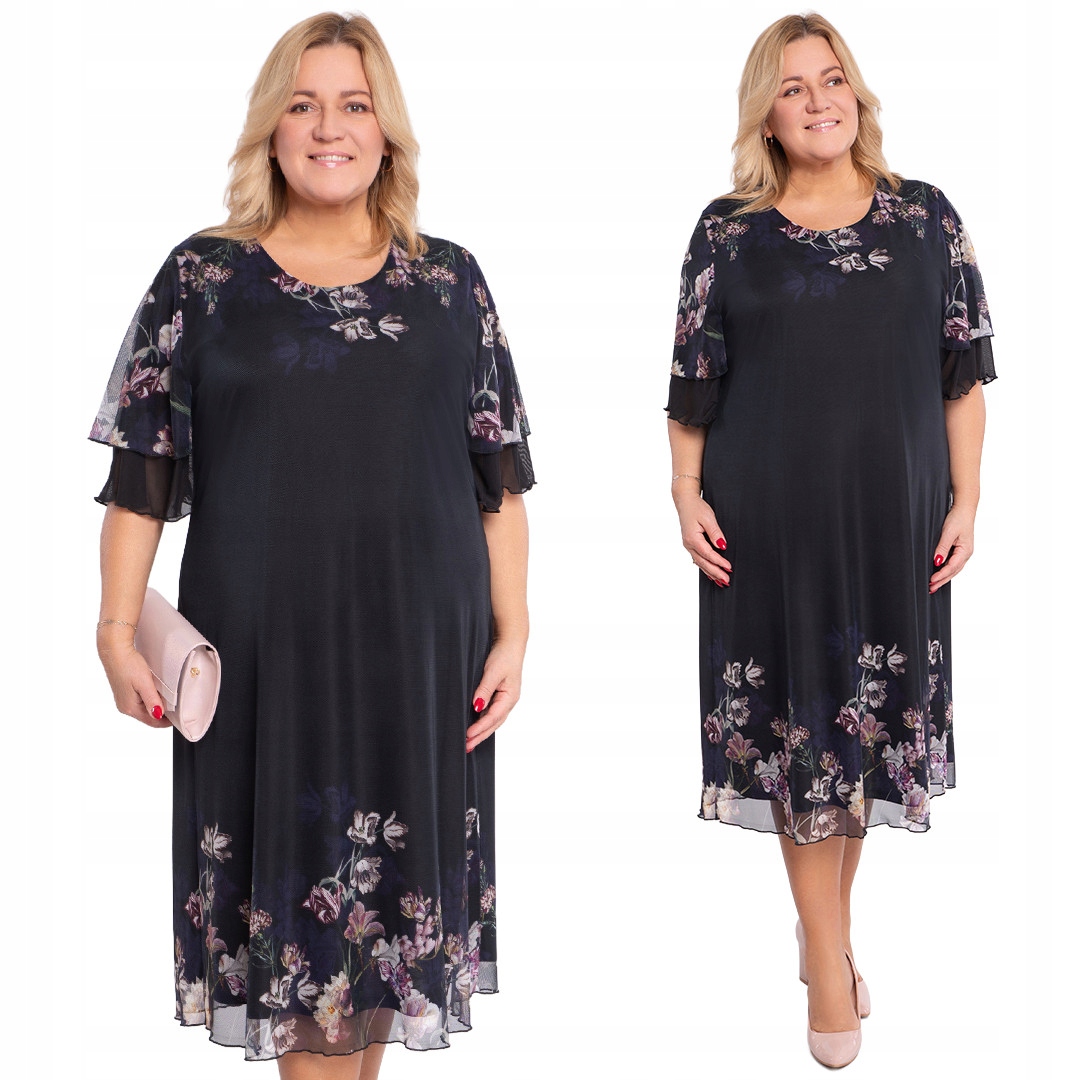 Šaty plus size v černé barvě, zdobená barevnými květy, je vyrobena z pružného, středně silného materiálu, který se měkce přizpůsobí postavě a zajišťuje pohodlí po celý den. Model je zakončen lehkou průsvitnou síťovinou s květinovým motivem, která dodává stylizaci výjimečnou lehkost. Kulatý výstřih a krátké rukávy vytvářejí harmonický, ženský střih vhodný pro mnoho příležitostí.
