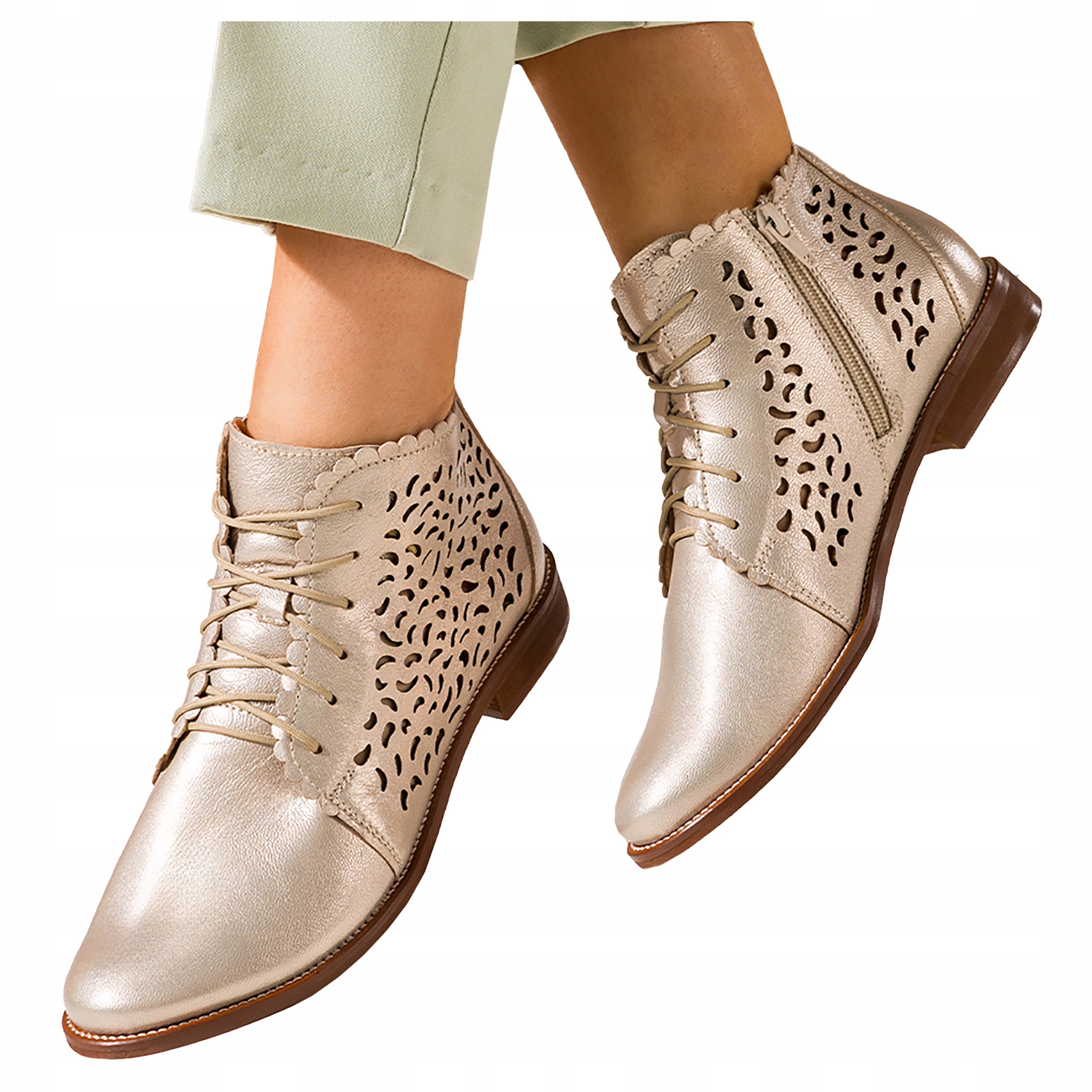 dámské kotníkové boty Kožené Jarní Zlaté Ažurové Šněrovací Produkt Polský