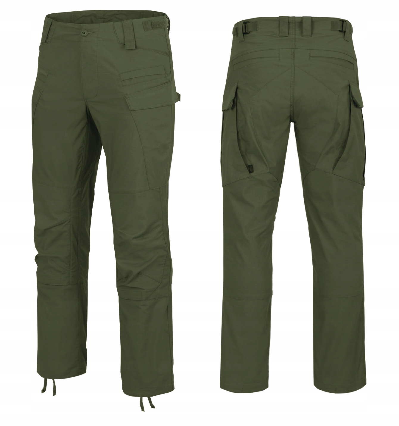 Profilované výztuhy na kolenou zabraňují vytlačování materiálu a mohou sloužit k přenášení vnitřních ochranných vložek. Kalhoty se zapínají na knoflíky s logem Helikon-Tex®, zatímco v pase jsou nastavitelné pomocí pásků na suchý zip.