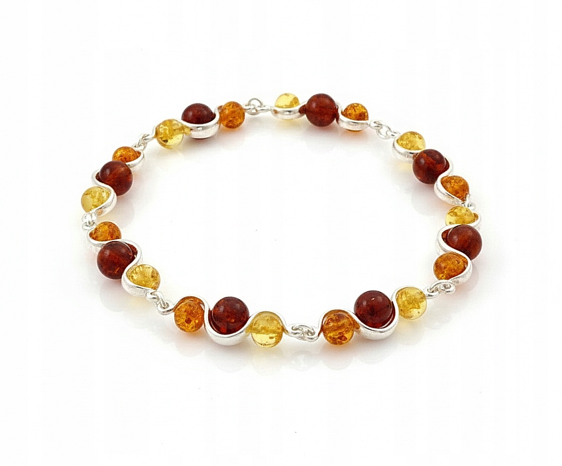 Dámský, moderní a velmi klasický náramek vyrobený ze stříbra ryzosti 925 a barevných jantarů. Vzor je elegantní a hodí se ke každé stylizaci.