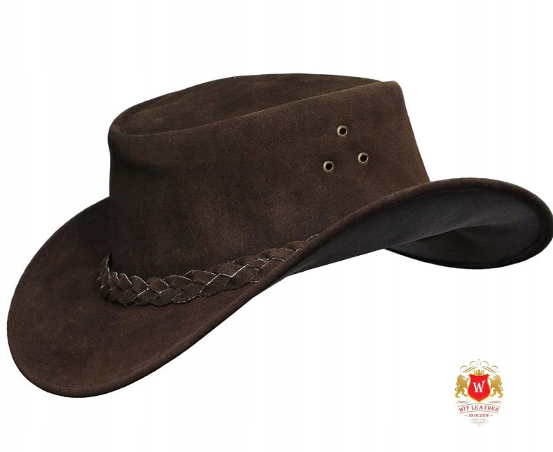 Kovbojský kožený klobouk model byl vyroben naší firmou ve Skoczowě z velurové hovězí kůže v hnědé barvě. Klobouk typu western je obepnutý koženým hnědým úpletem. V klobouku byly na každé straně vytvořeny tři větrací otvory. Na přání zákazníka vyrábíme klobouk spolu s koženým řemínkem a zarážkou pod bradu. V obvodu kruhového objezdu je všitý drát, díky kterému lze jeho tvar libovolně profilovat.