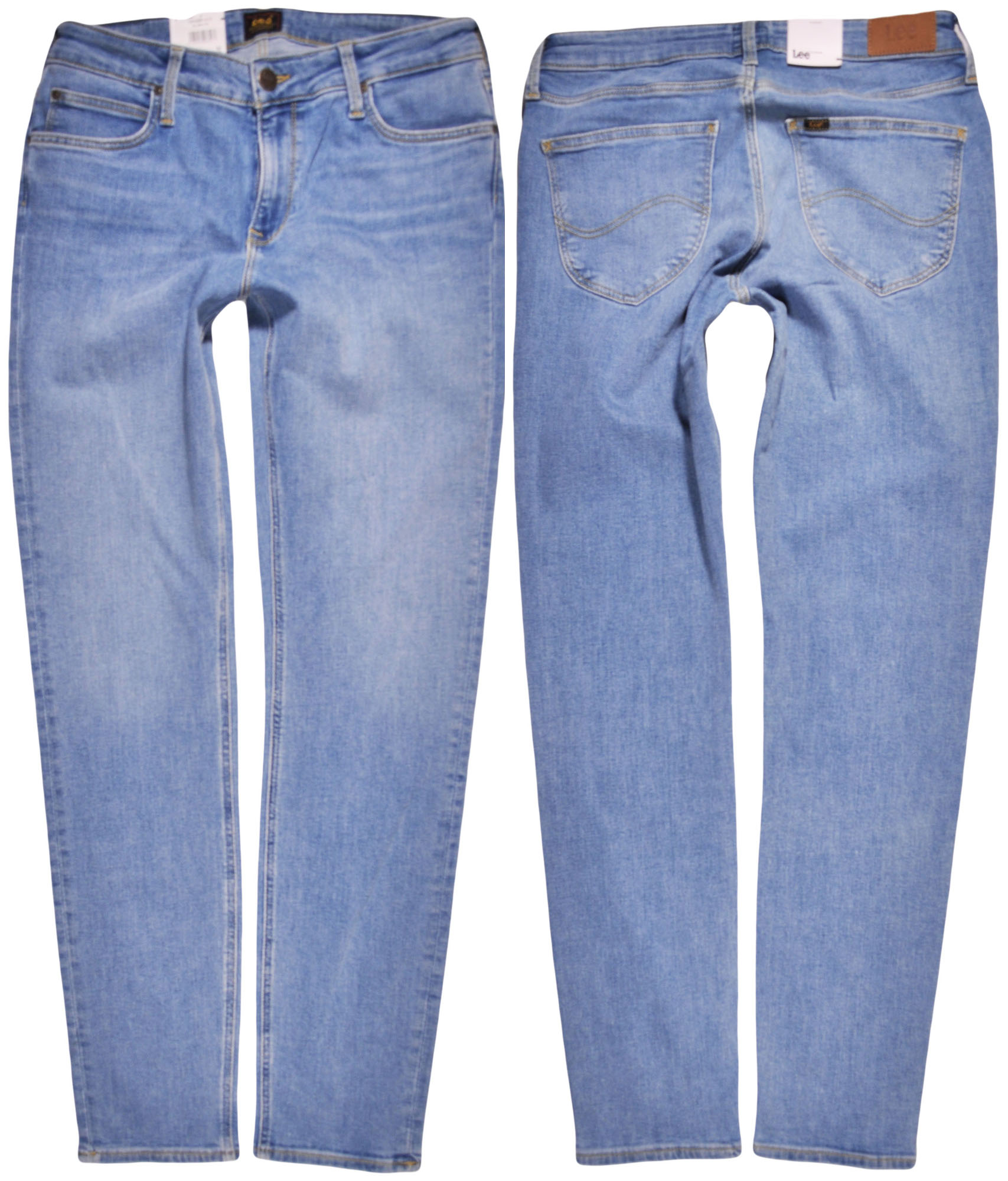 Dámské klasické džínové kalhoty se zapínáním na zip a značkový knoflík. Úzké, rovné nohavice. Přední kapsy s nýty. Vzadu na pásku kožená nášivka s vyraženým logem výrobce. Modrá barva.