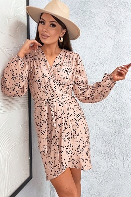 Šaty s přídavkem viskózy. Módní vzor s puntíky. Obálkový výstřih. Délka před kolenem. Dlouhé rukávy zakončené gumičkou.