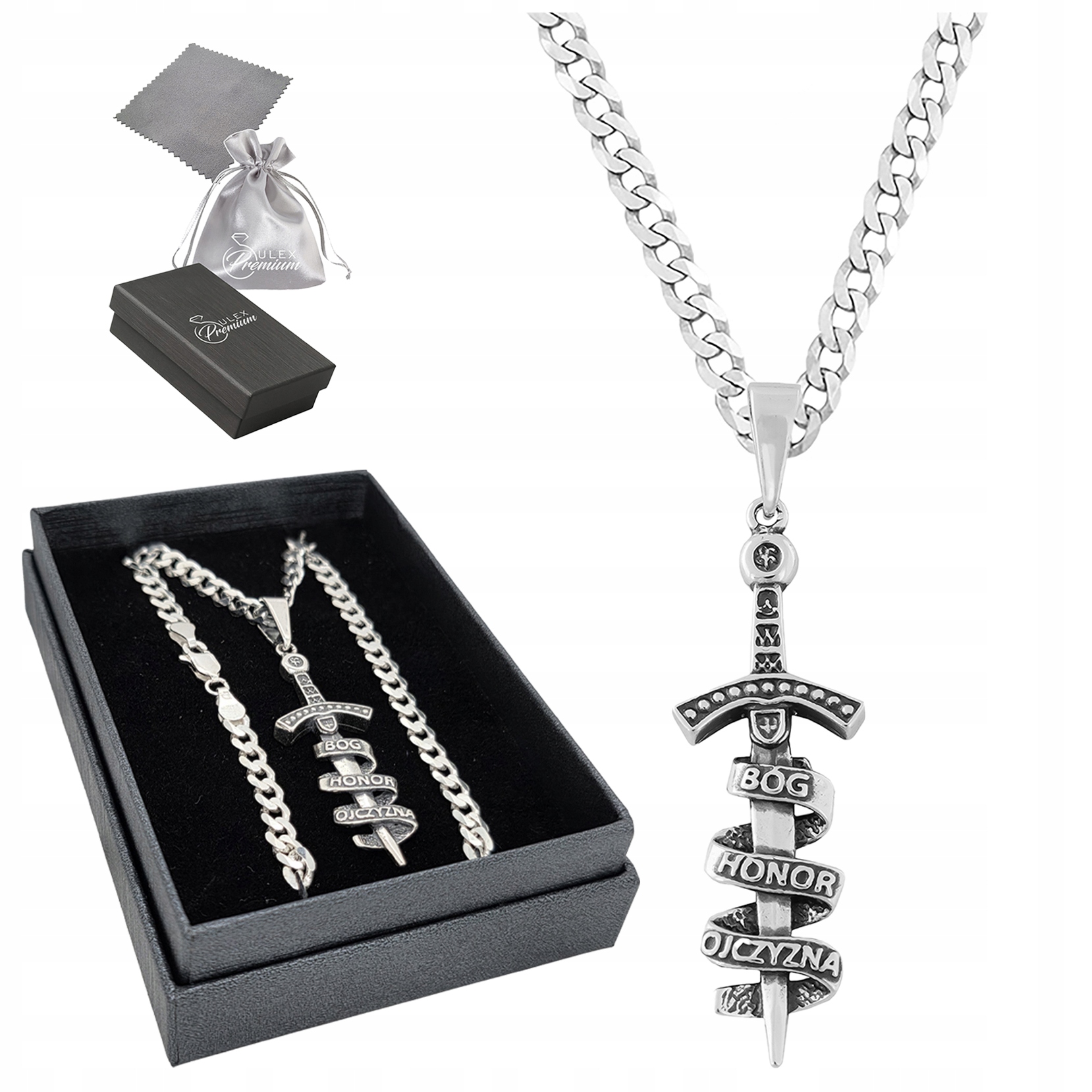 Výjimečný náhrdelník s přívěskem ve tvaru štěrku – symbolu odvahy, statečnosti a polské národní identity. Na ostří meče jsou vyryta slova „BŮH“, „ČEST“, „VLAST“, která tvoří základ vlasteneckých hodnot. Přívěsek byl pečlivě vyroben s důrazem na každý detail a dodává mu výrazný a elegantní vzhled.