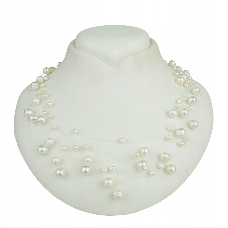Neobvyklý náhrdelník s pravými sladkovodními perlami. Perly mají různé velikosti, krásnou bílou barvu s výrazným leskem. Jsou umístěny na tenkém, průhledném nylonovém vlasci, který je málo viditelný a velmi odolný.