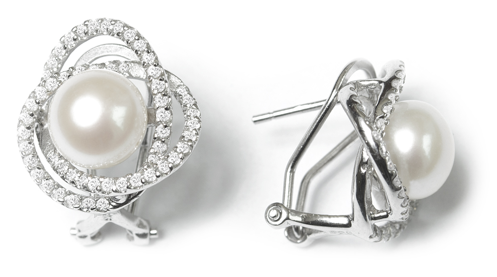 Excentrické stříbrné náušnice s pravými sladkovodními perlami. Stylové stříbrné obruče jsou osázeny zirkony v množství více než sto kusů na pár. Takové náušnice rozzáří každou kreaci.