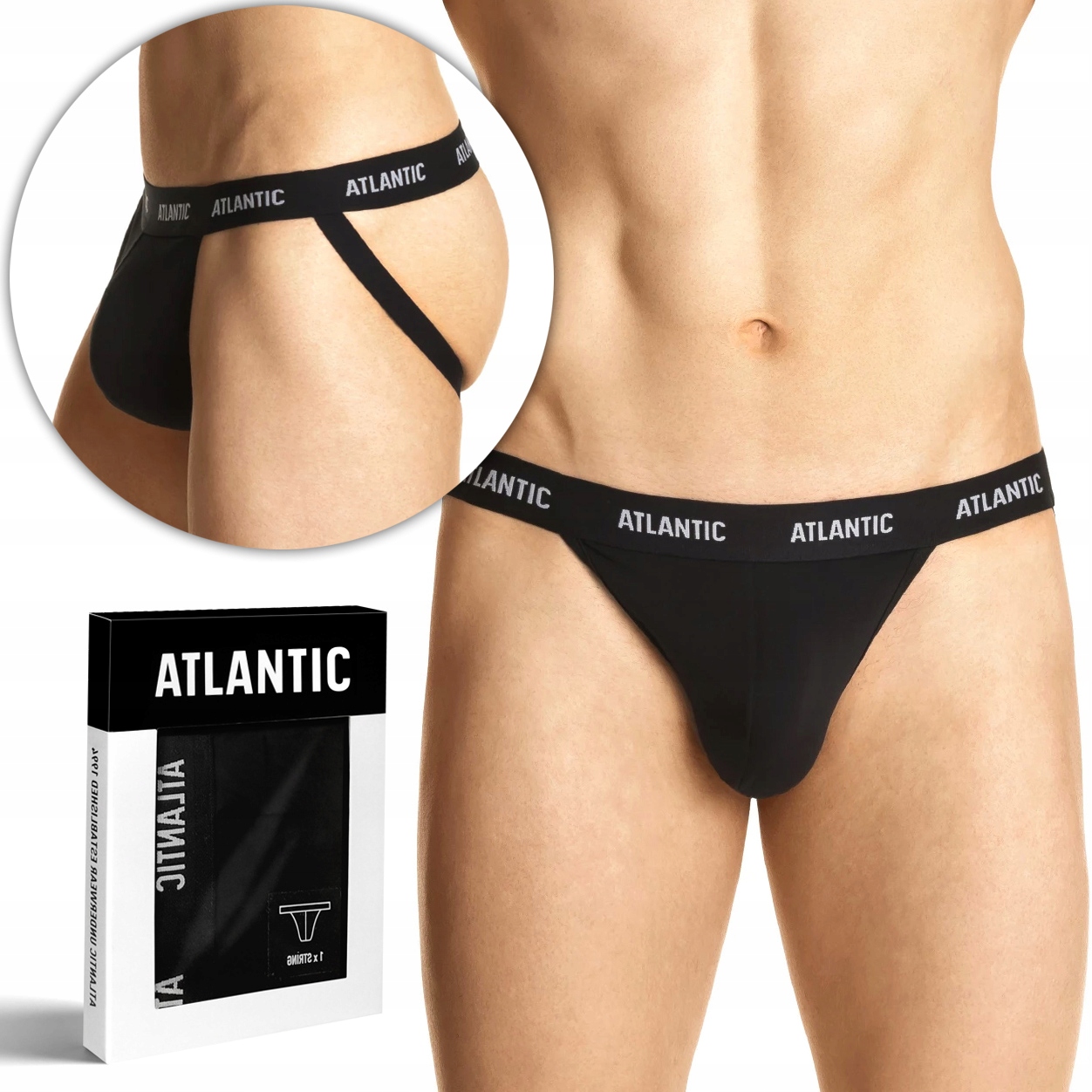Velmi nízký pas je vyznačen měkkou a netlačící gumou zdobenou logem Atlantic, které zároveň tvoří boky spodního prádla. Na zadní straně spodní prádlo kompletně odhaluje zadeček – zadek jsou vyznačeny pouze gumovými pásky.