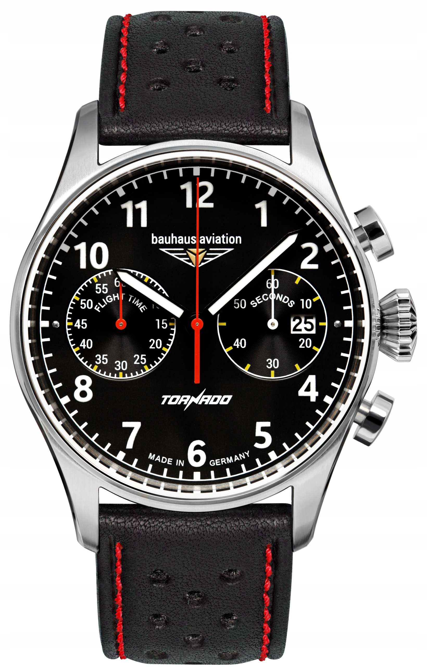 ⬛Model Bauhaus Aviation Tornado 2770-2 jsou hodinky v leteckém stylu, které upoutají pozornost kontrastním černým ciferníkem a červenými akcenty. Funkce chronografu s dílčími ciferníky měřícími dobu letu a sekundy a datumovka na pozici 4 hodin zajišťují praktičnost a přesnost. Černý perforovaný kožený řemínek s červeným prošíváním dokonale ladí s ciferníkem a dodává hodinkám dynamický a sportovní charakter. Quartzový strojek zaručuje spolehlivost a německá kvalita provedení činí tento model ideální volbou pro milovníky hodinek inspirovaných letectvím.