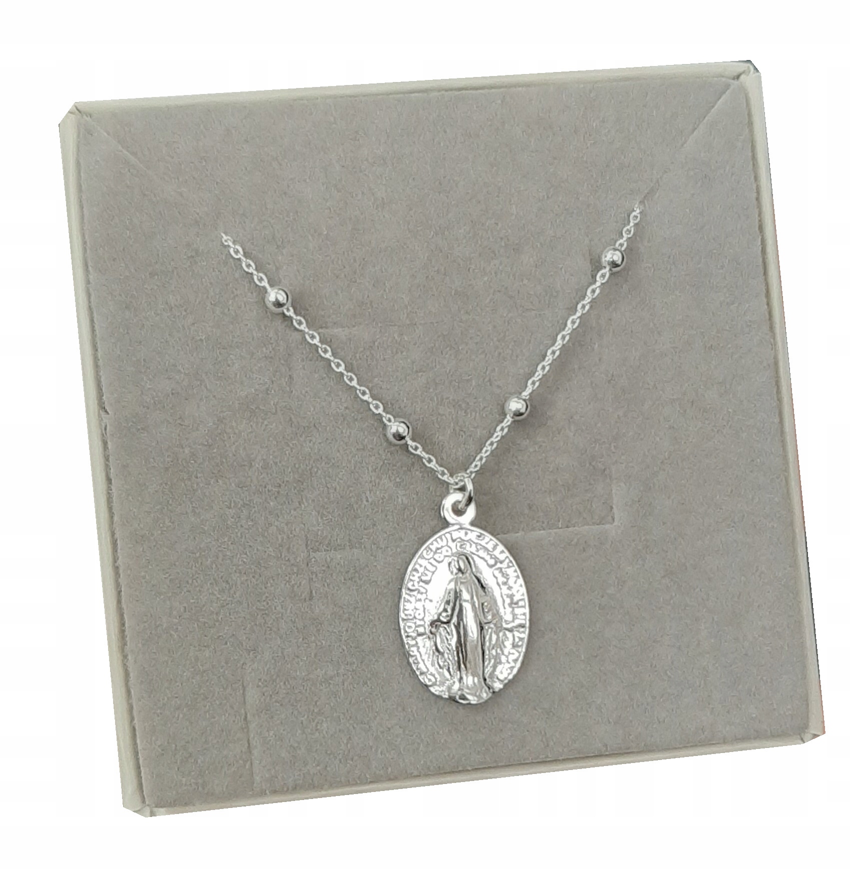 Náhrdelník stříbrný řetízek s Pannou Marií Neposkvrněnou. Délka náhrdelníku: cca 45 cm Rozměr přívěsku: 24 mm x 9,5 mm Průměr řetízku – 1,3 mm Provedení: stříbro nejvyšší kvality 925 Hmotnost výrobku: cca 2,5 g