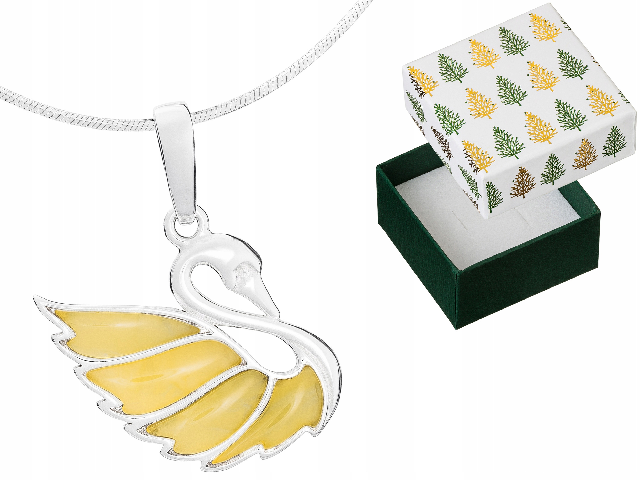 labuť s jantarem na řetízku – P1NZ608(75) v sadě s ozdobnou dárkovou krabičkou.