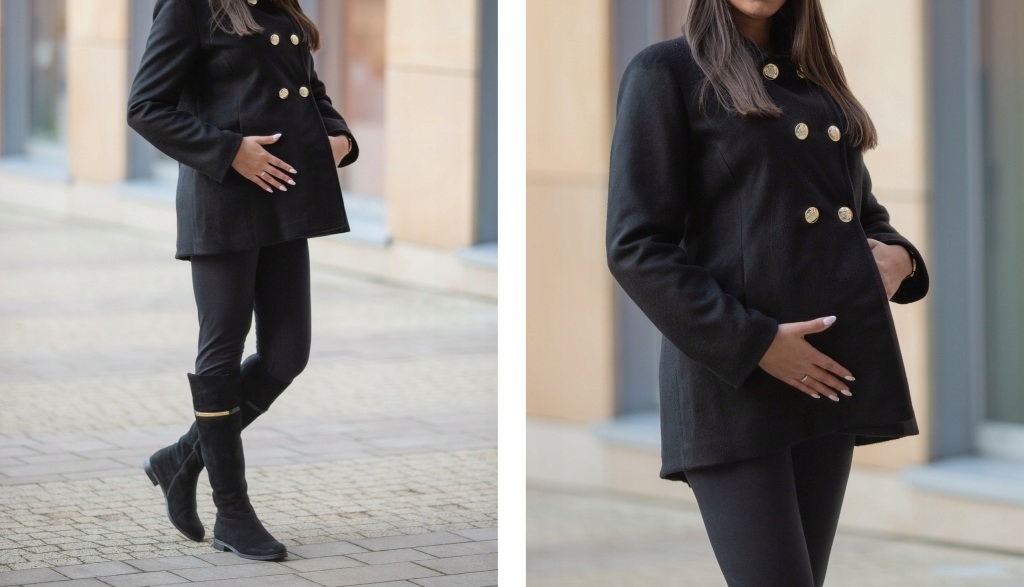 Krásný, elegantní kabát pro těhotné ženy, ideální pro přechodnou sezónu i lehkou zimu. Vyroben je z flauše, díky čemuž poskytuje vynikající ochranu před chladem a nepřízní počasí a je zároveň příjemný na dotek a šetrný k pokožce. Uprostřed je zakončen černou podšívkou. Kabát je dokonale přizpůsoben postavě a přitom je velmi pohodlný a neomezuje pohyb. Na zadní straně je dlouhý zip umožňující rozšíření kabátu. Kabát je velmi univerzální, hodí se pro různé příležitosti a k různým stylizacím. Může být úspěšně využit i po těhotenství.