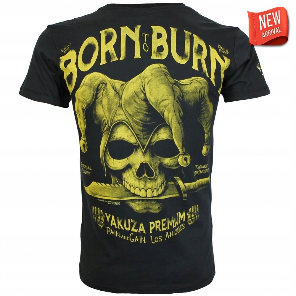 Pánské tričko Yakuza Premium YPS 3910 v černé barvě. Regular fit střih, 100% bavlna, potisk Born to Burn s lebkou šaška a nožem na zádech i menší motiv vpředu. Part 27 – podzim/zima roku 2025